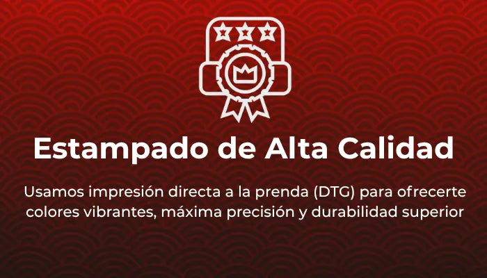 Cada prenda cuenta con un diseño totalmente unico y original, está elaborada con algodón 100% de 270 gramos, ofreciendo calidad premium, durabilidad y confort. Además, utilizamos estampado DTG (Direct to Garment) de alta definición para máxima calidad en los diseños.