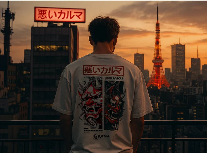 Una historia contada en tres escenas: templo, dojo, ola. Simbolizan el origen, la disciplina y el caos que regresa. El mensaje es claro: lo que das, vuelve. Vestir esta pieza es vestir tu intención. Una invitación a actuar con propósito y vivir con balance.